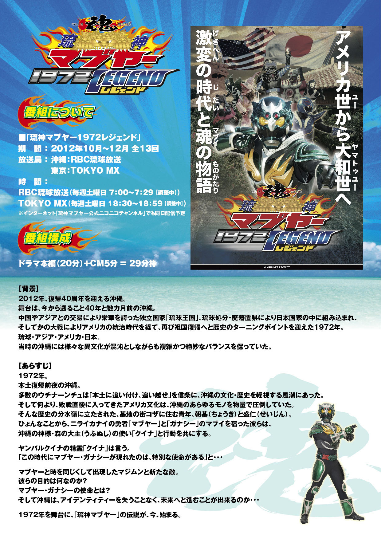 2012年10月より、沖縄:RBC琉球放送、東京:TOKYO MXにて放送が開始される、沖縄で絶大な人気を誇る「琉神マブヤー」最新作「琉神マブヤー1972レジェンド」の主題歌を、紫(MURASAKI)が務めることになりました。 この「琉神マブヤー1972レジェンド」の主題歌は、お馴染みの「琉神マブヤー」主題歌を、Chrisがロック・バージョンにアレンジを行い、JJが英語バージョン(ジョージ紫監修)、ドラマーのCHIBIが日本語バージョンを歌っています。 各メンバーのソロも聞きのがせない内容です。